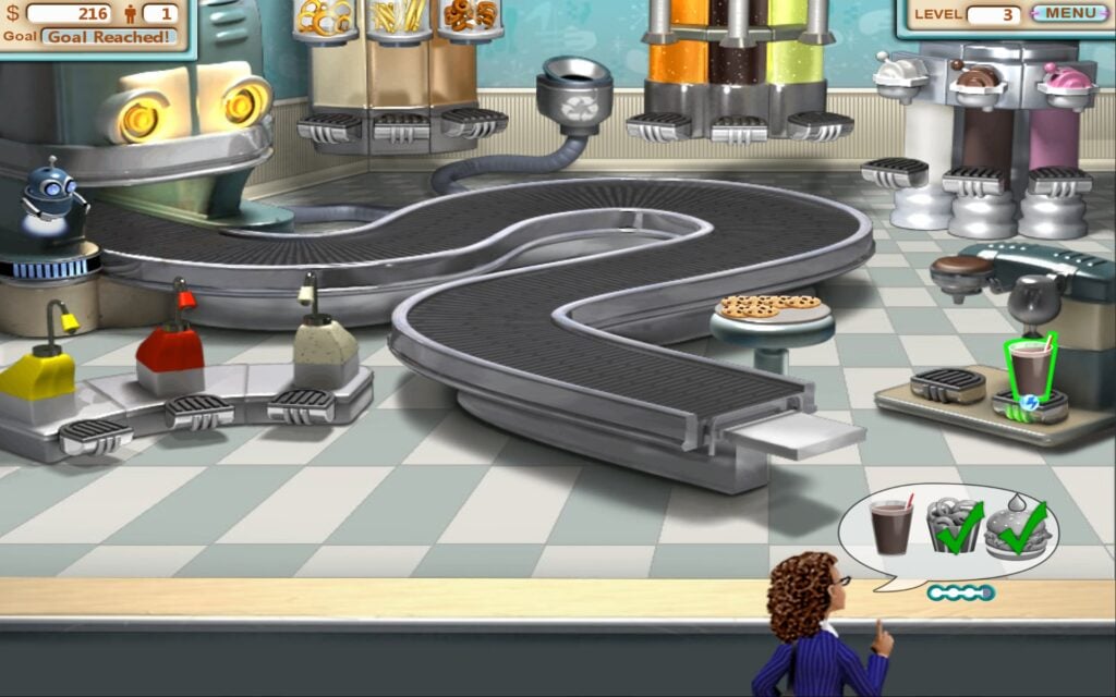 But to make things easier you get upgrades to assist you. Some are active such as a robot that completes one order of your choice. Other power ups are more passive and appear on some items of food. If food with power ups is given to a customer it benefits you in a variety of different ways. Whether it is allowing your equipment to cook food instantly or giving you extra cash for that item. You can also give out cookies to customers in order to appease them for a few moments. But, you only have so many cookies to give out each level. Unless, you are able to use the power up to get more cookies that you can have more to hand out.