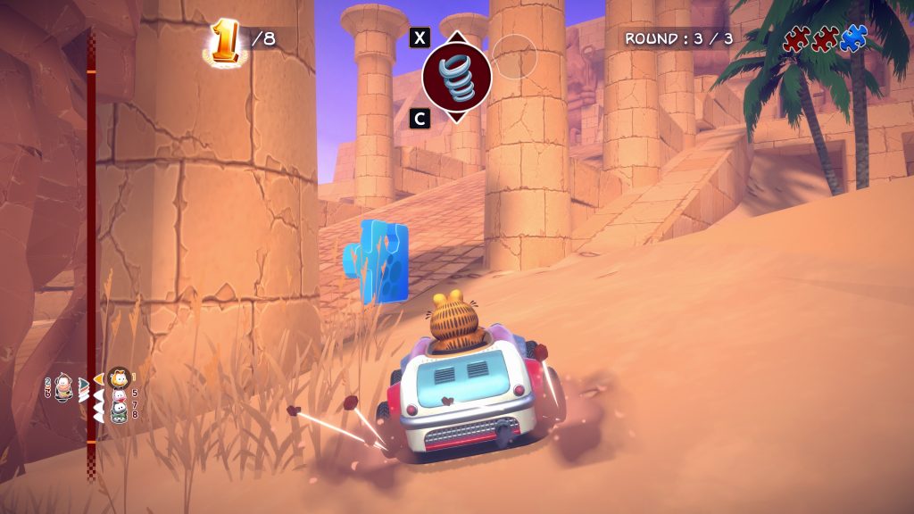 This game also doesn’t utilise the Garfield theme to the full potential it could have had. I think this as the tracks in game are generic settings. For example, the tracks are of various settings such as mountains and the desert. Whilst I’m not one to criticise the tracks as the tracks on offer are decent. I think that the game could have had tracks that are more relevant to Garfield. Particularly, tracks where you race around various settings that are in Garfield Comics instead such as Jon’s house. Personally, I would have preferred to have been on tracks related to Garfield rather than generic settings.
