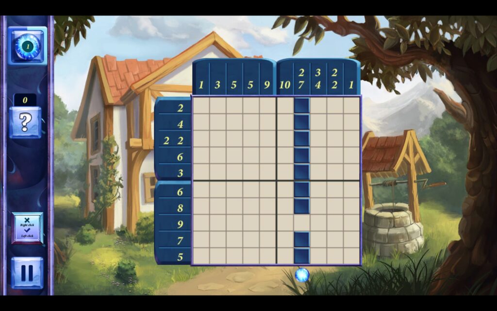 I also don’t like that this game is poor at providing any visual hints. In particular the game doesn’t provide any help in when you are completing puzzles. This game will not cross out numbers that you have completed. The only clue the game will provide is an orb at the other side of the board. The game will only provide you that hint when all the numbers for that row have been done. For example if a row says 5, 2 and you place 5 tiles together onto the board. The game won’t acknowledge your actions. Even if you place an X after it won’t mark the 5 as being completed at all.