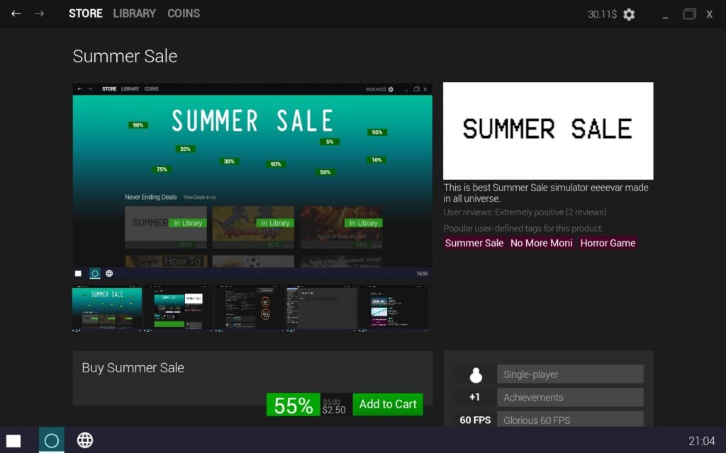 Winter sale (also known as summer sale in the steam store) is a satirical game that is centred on the steam winter sale. The main layout of the game being a copy of the steam application layout with various jokes/memes present around steam/computer culture. This game is a simulator of the steam winter sale. As you may expect the main objective of this game is to buy every game that is available on the store.